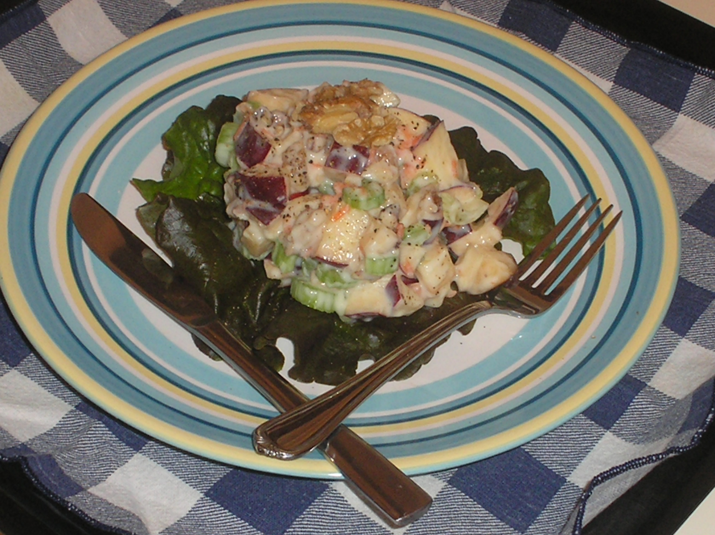 In a small bowl, combine the apples, dried strawberries and celery. Add yogurt and mix thoroughly. Serve on separate plates topped with almonds and garnished with grated carrots.