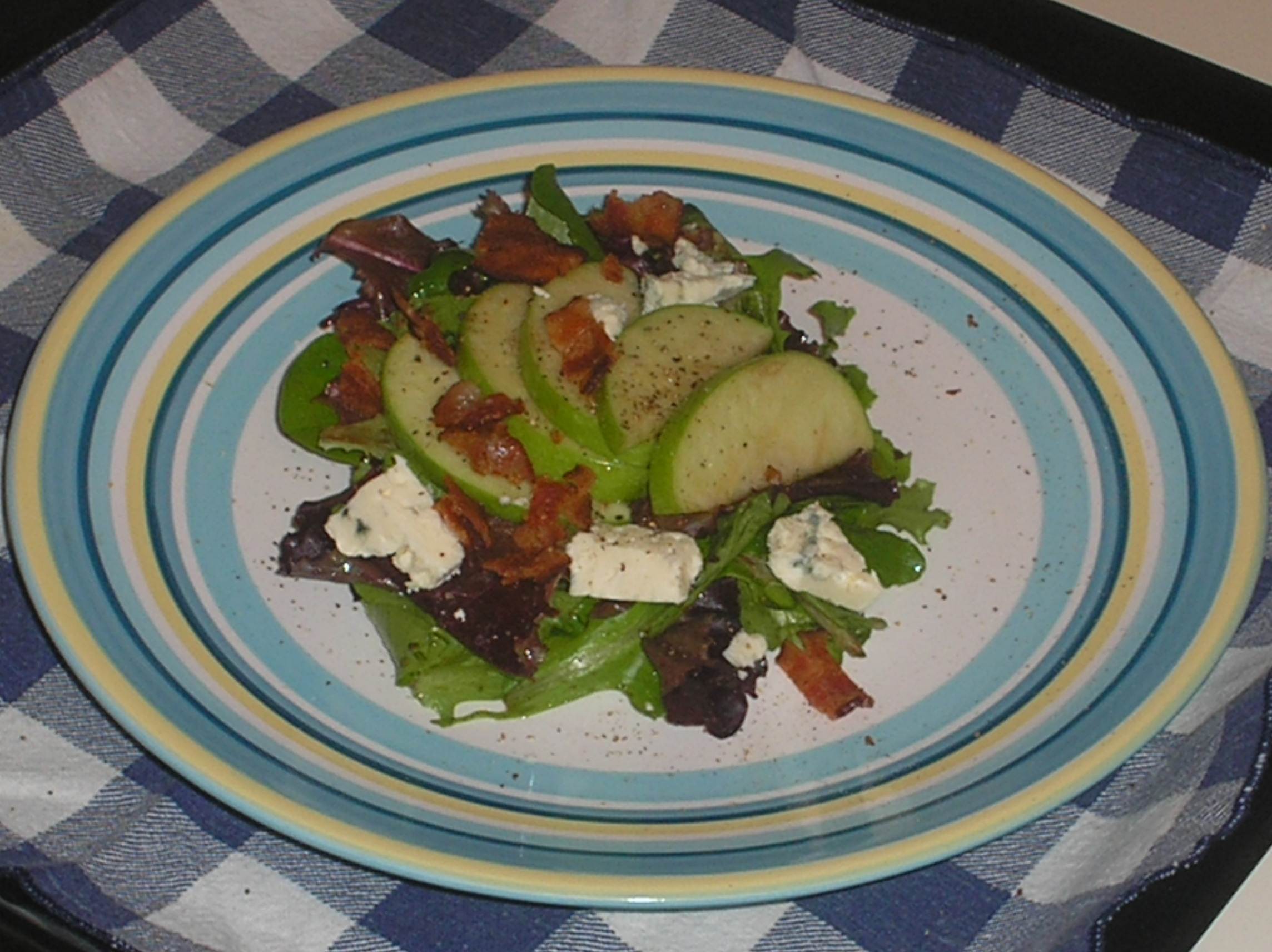 Add warm bacon 3/4 of the crumbled bleu cheese and the apple pieces to the dressed greens and toss again.